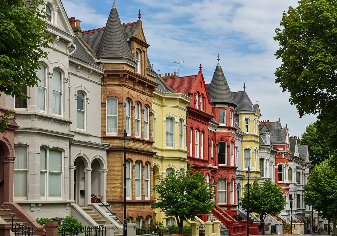 The most common characteristics of the Victorian style are steeply pitched roofs, plain or colorfully-painted brick, ornate gables, painted iron railings, churchlike rooftop finials, sliding sash and canted bay windows, octagonal or round towers and turrets to draw the eye upward, two or three story-buildings, generous wrap-around porches, small gardens, and asymmetry.